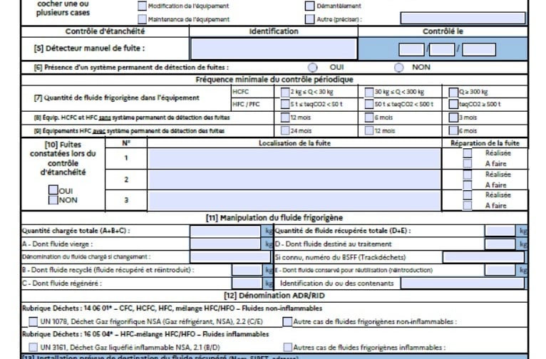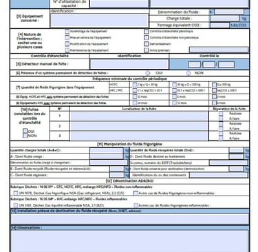 A la fin de toute opération ayant nécessité une manipulation de fluide, l'opérateur doit vous remettre de manière OBLIGATOIRE un document CERFA 15497 rempli par ses soins et expliquant ce qu'il a fait. Il devra notamment indiquer les numéros de série de ses appareils de mesure ainsi que les dates de révision. Tout manquement à cette règle expose la société à une amende.